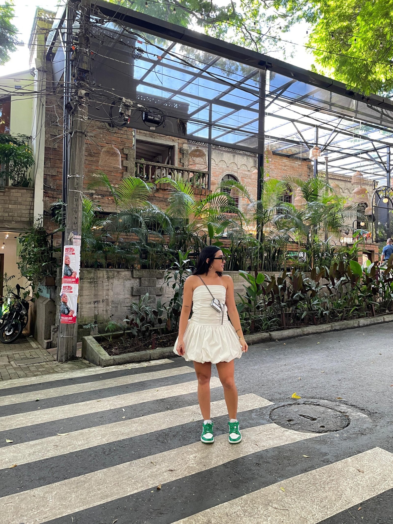 Escote palabra de honor (strapless) con cuerpo drapeado que define la silueta. Corte tipo globo, que aporta volumen y un toque vanguardista.