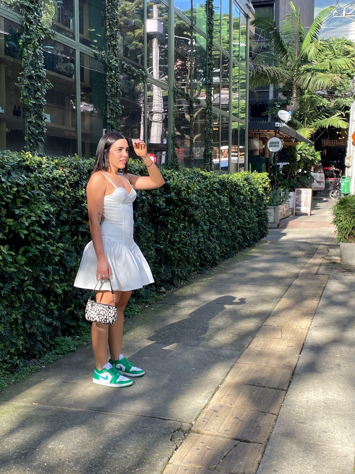 Vestido con copas estructuradas, cintura baja en «V» con falda.