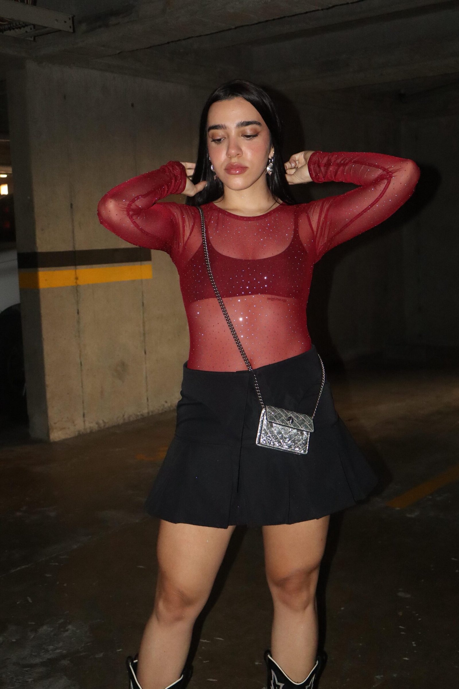 Body con malla elástica, ajuste slim fit de manga larga, cuello redondo y terminación tipo hilo con broches.
