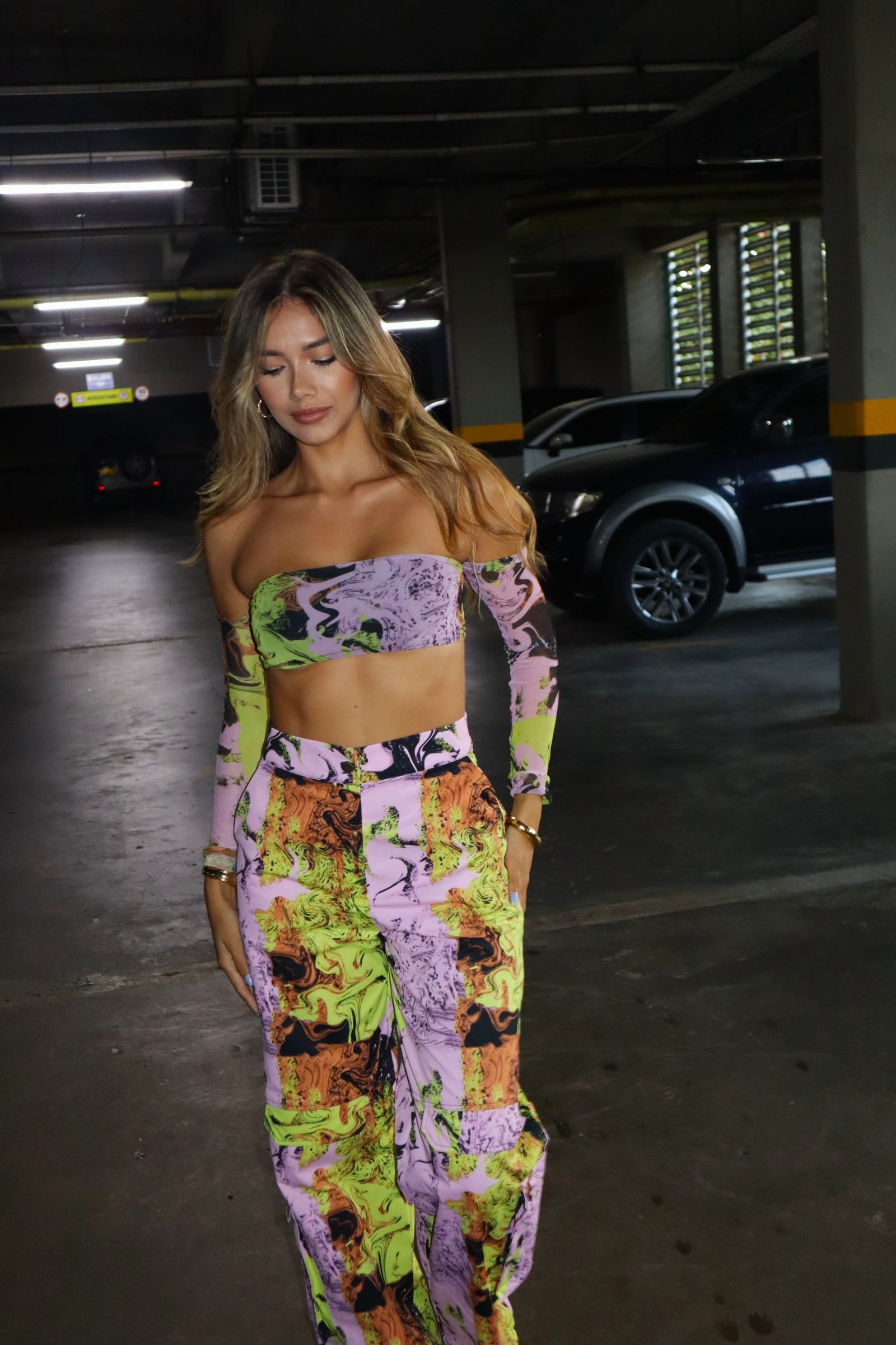 Top en mallatex con mangas separadas, hombros descubiertos y amarre en la parte trasera.